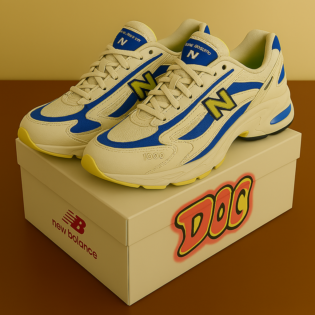 New Balance DOC 1000 – Beige Sneakers with Blue & Yellow Accents | Stylish Streetwear with Bold Branding