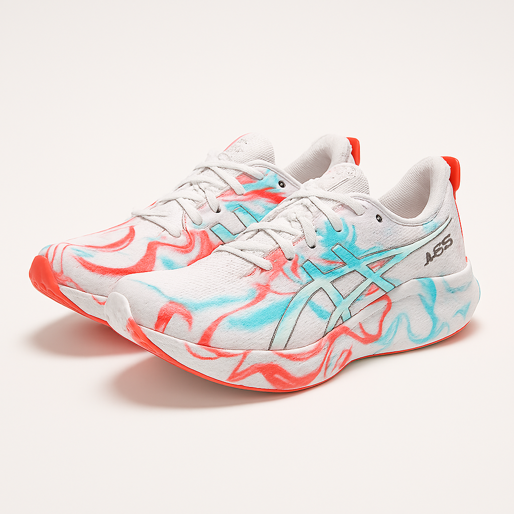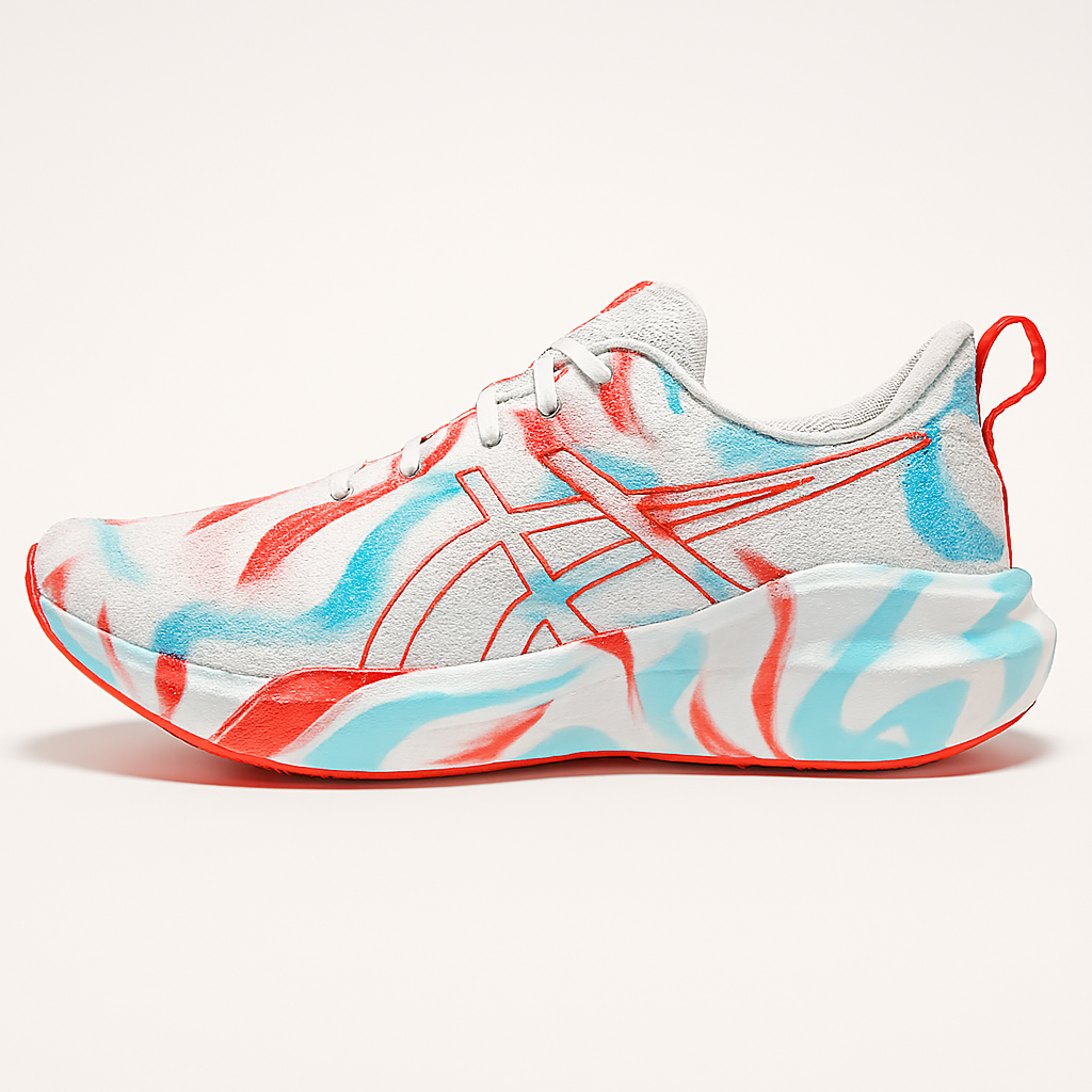 Unleash your stride with this electrifying ASICS sneaker—where performance meets pure expression. The white base is splashed with kinetic red and blue strokes, creating a dynamic canvas of motion and style. From the abstract sole detailing to the bold side logo, every inch speaks of speed, individuality, and urban edge.