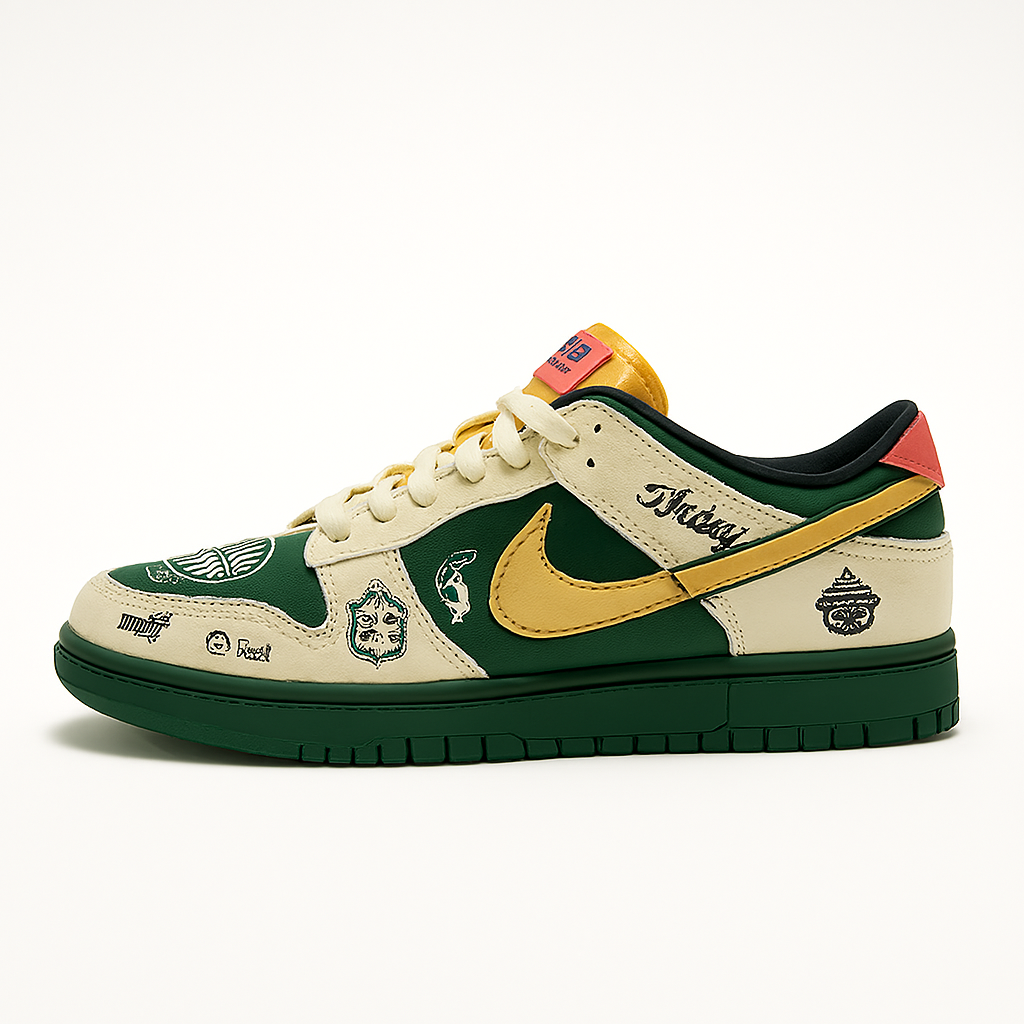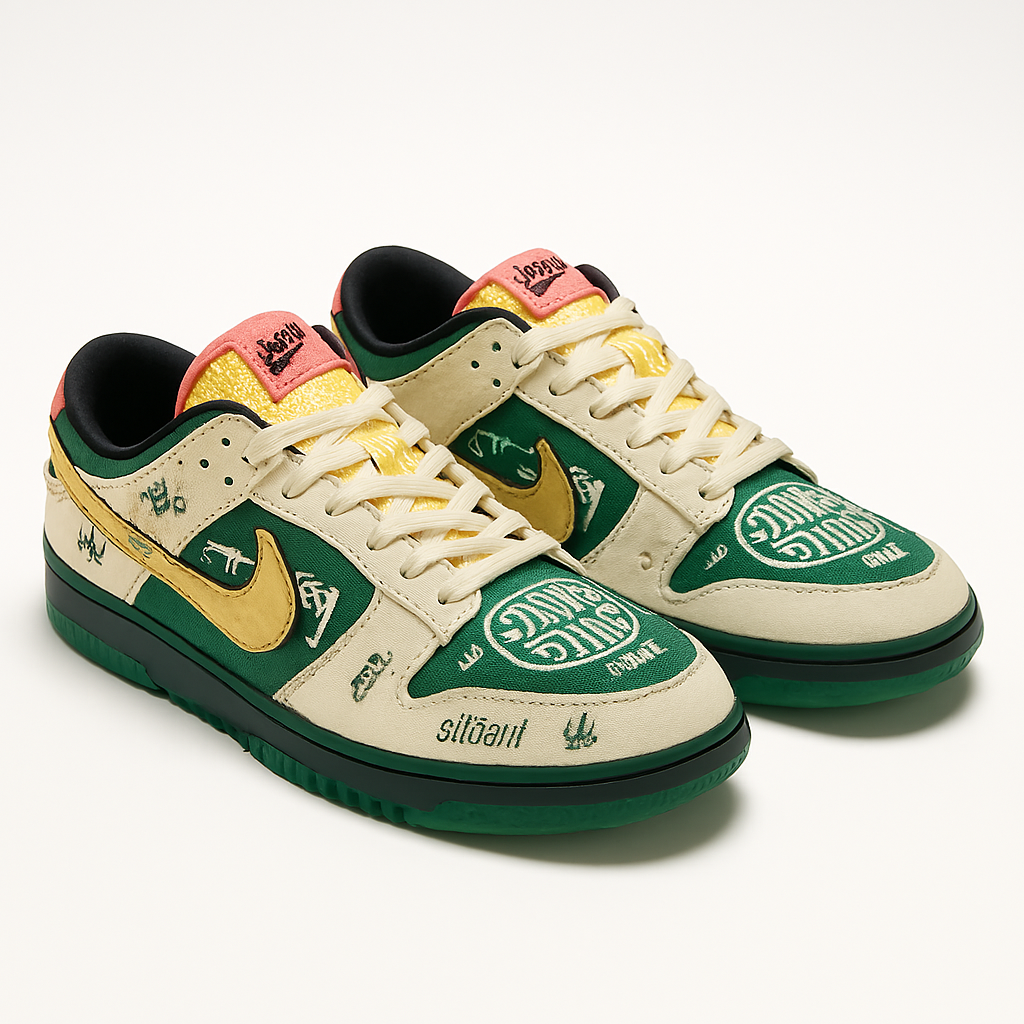 Step into a canvas of creativity with this limited-edition Nike Dunk, where every panel tells a story. A fusion of green, cream, and yellow tones sets the stage for expressive graphics and layered typography—featuring stylized prints like “DUNK” and “sitoänt” that nod to underground culture and design rebellion. The gold swoosh adds a luxe contrast, while the pink tongue and green sole inject unexpected vibrancy.
