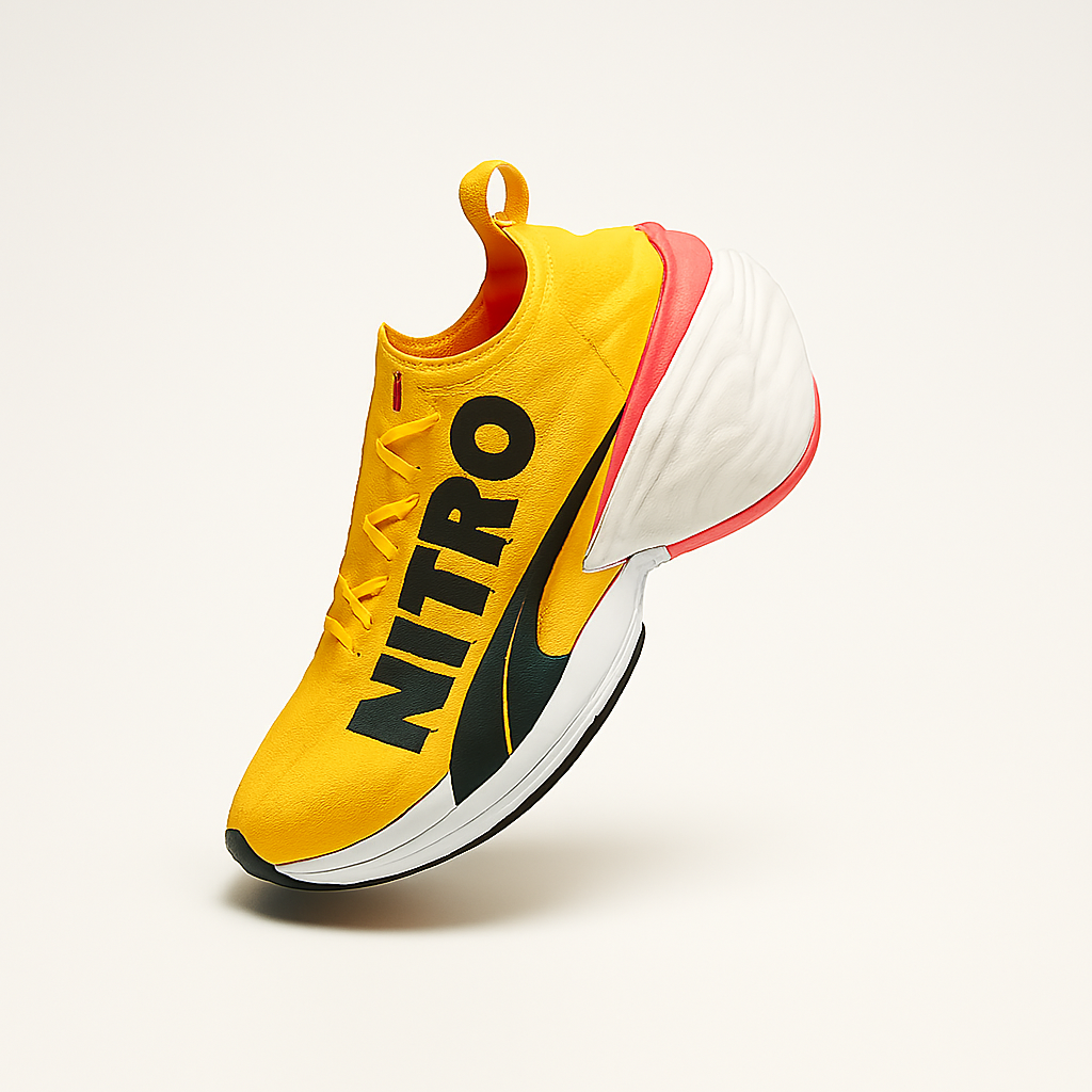 nleash your stride with the Puma NITRO—engineered for speed, styled for impact. Drenched in electric yellow with bold black “NITRO” branding, this pair commands attention from track to street. The sleek silhouette features a breathable mesh upper, dynamic overlays, and a sculpted sole with pink heel accents for a flash of flair.